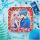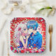 Chico y chica de anime abrazados rodeados de flores coloridas. Lindo pareja de anime, chica con cabello rosa y chico con cabello azul. Los colores son rojo, azul, blanco, rosa y morado. Bonito para bodas, Día de San Valentín o aniversario.
