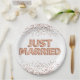 Estos platos fiestas personalizados presentan una temática festiva boda sobre un fondo blanco. La frase "Just Married" se imprime en globos de Relieve metalizado dorado de aspecto brillante y rosa. El confeti Rosa purpurina oro acentúa las partes superior e inferior.