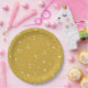 Patrón cielo estelar dorado de brillantes estrellas en tamaños mixtos sobre un fondo dorado antiguo puede cambiar a cualquier color. Los platos de fiesta amarillo celestial añaden un alegre toque de ocre a la decoración fiesta bohemia. ♡ Idyllfire