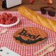 Boo! en texto de estilo grunge con silueta de murciélago negro sobre fondo naranja con superposición de eslabón de cadena