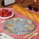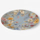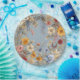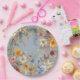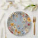 Bonito y elegantes platos de papel con un borde profundo de flores mixtas sobre un suave fondo azul mudo.