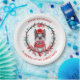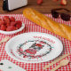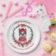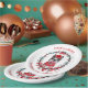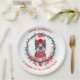 Platos de papel adornados con un Boston Terrier adornado con colores de Navidades rojos con una corona de luces de Navidades. Se ofrecen servilletas, embutidos y tazas de papel similares.