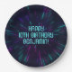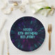 Chico neón verde azulado resplandece platos de papel de cumpleaños.