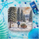 A young boy in a red hat and blue coat pulls a sled filled with Christmas greenery through a snowy forest, with a cozy cabin nestled among the trees in the distance