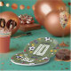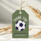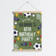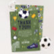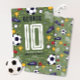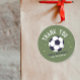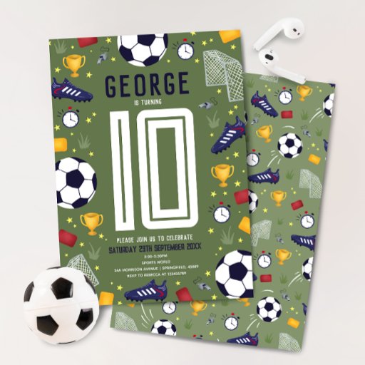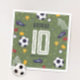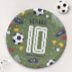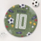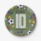 This cute and modern soccer-themed kids party plate features a vibrant green background with playful illustrations of a football (soccer ball), trophies, stars, goals, and soccer boots. Personalize the text to suit any age. Perfect for boys’ soccer parties!