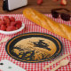 Divertidos platos de papel de Halloween en naranja y negro con una bruja en su escoba sobrevolando una casa espeluznante y árboles.