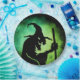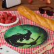 Plato de papel con una silueta negra de una vieja bruja revolviendo un caldero sobre un fondo negro y verde.