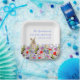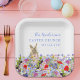Acuarela Almuerzo de Pascua y plato de papel floral primavera de caza de huevos ideal para un fiesta de jardín de primavera. Tipografía de escritura a mano azul de Cornflower con plantillas fáciles de personalizar para que puedas agregar tu nombre de familia. Hermoso de Pascua en un prado de flores silvestres. Un adorable y sencillo diseño moderno, perfecto para un fiesta de eventos al aire libre en primavera. Pintura original de la artista Catherine Sweetman