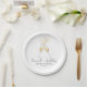 Platos de papel festivos y elegantes para su fiesta de compromiso, cena de ensayo o boda con un par de copas de champán brindando en acuarela, llenas de burbujas brillantes.