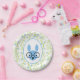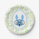Un conejito adorable con gafas adorna este plato fiesta de primavera en azul y verde. Es una gran elección para la primavera y la temporada de Pascua. También es una buena opción para los fiestas infantiles. En este diseño también se pueden encontrar servilletas de papel coincidentes. Gráfica de conejo cortesía de vecteezy.com.
