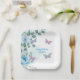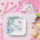 Mariposas Floral Azul Púrpura Dorada Placas de Papel de Cumpleaños. El diseño tiene unas mariposas y flores de color rosa y púrpura adorables y salpicaduras de color azul acuático.