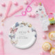 The phrase “Oh my, a little butterfly” is highlighted in a graceful modern script font, perfectly complementing the soft, playful palette of pink, beige, sunny yellow, magenta, and royal blue. This paper plate blends modern elegance with a touch of fairytale whimsy — ideal for a spring, garden, or butterfly-inspired baby shower.