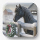 Un caballo negro se para cerca de una valla cubierta de nieve decorada con una corona festividad