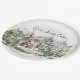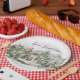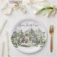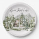 En el exterior, este plato rústico de papel, con una cabaña acuarela, está escondido en un bosque de pino verde niebla. Perfecto para los amantes de la naturaleza, este elegante diseño boscoso captura el paisaje sereno de montañas y árboles, vigas naturales además de su espacio de reunión.