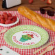 Placas personalizadas de papel de cumpleaños con un lindo ilustracion de un cactus verde sentado en una maceta de flores. Grandes ojos kawaii y con sombrero rojo. El fondo es un patrón con movimientos verdes de cal.
