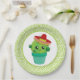 Un plato de papel con un lindo ilustracion de un cactus verde sentado en una maceta de flores. Grandes ojos kawaii y con sombrero rojo. El fondo es un patrón con movimientos verdes de cal.