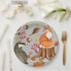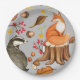 Los platos de fiesta de papel con temática de los bosques de otoño incluyen zorro y badger con hojas, bayas, setas y bellotas sobre fondo gris claro.
