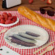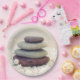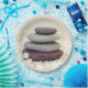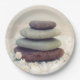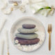 Placas de papel con una fotografía con piedras apiladas unas encima de otras. Rodeado de rocas blancas sueltas y flores blancas.