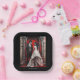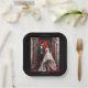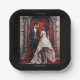 Una pareja de Bodas Góticas vestida con atuendo de boda parada bajo un arco romano. El fondo está pintado de forma espectacular en tonos rojos, evocando una sensación de mancha de sangre que añade un ambiente oscuro y espeluznante a la escena. El novio lleva puesto un traje negro con un boutonniere rojo, y su pelo está estilizado de manera elegante y gótica. La novia luce un vestido blanco adornado con motivos intrincados y su largo cabello oscuro que complementa la temática gótica. Ambos personajes tienen complejidades pálidas y una presencia etérea, enfatizando aún más la estética gótica. El ambiente general es una mezcla de romance y macabro, característico del arte gótico.