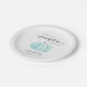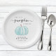 Platos de papel cortos para la ducha de un bebé con "A Sweet Little Pumpkin Is On His Way" en una tipografía gris simple y un guión elegante, y una acuarela azul pastel de una calabaza.