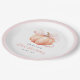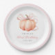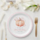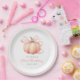 Este elegante y encantador plato de papel de primer cumpleaños presenta un hermoso ilustracion acuático de una calabaza con una delicada cinta rosa, perfecto para celebrar el primer hito de su pequeña.