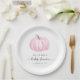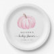Estos adorables y mínimos platos de papel de ducha de bebé, con una acuarela rosa pastel de una calabaza, una "ducha de bebé" en un guión elegante, y el nombre y la ducha de la futura madre en una mezcla de tipografía moderna y manuscrita.