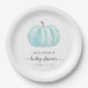 Estos adorables y mínimos platos de papel para niños pequeños tienen una acuarela azul pastel de una calabaza, una "ducha de bebé" en un guión elegante de bonito, y el nombre y la ducha de la futura madre en una mezcla de tipografía moderna y escrita a mano.