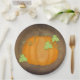Gráfico de calabaza naranja con hojas de punto de polka sobre fondo marrón texturado. Se puede cambiar el fondo.