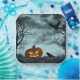 Vibrante diseño de Halloween que incluye una calabaza brillante con ojos y dientes brillantes en un paisaje oscuro con árboles y cuervos.