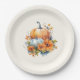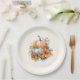 Placas de papel con una imagen con temática de caída. Calabazas naranjas y blancas rodeadas de hojas caídas y flores naranjas.