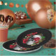 Placas de papel con un ilustracion de estilo gótico. Hermosas rosas rojas y hojas de oro rodeando un cráneo blanco y negro.