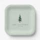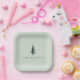 This wedding plate features a minimalist design with a stylized evergreen tree centered on a soft, muted greenish-gray background. The layout is clean and balanced, creating a serene atmosphere perfect for an elegant celebration. Below the tree, modern sans-serif typography adds a touch of sophistication, making it ideal for weddings or special occasions that embrace nature's beauty. The contemporary style evokes feelings of calmness and harmony, ensuring your event exudes understated elegance.