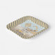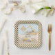Creado con una acuarela silenciosa menos tradicional, este diseño de Baby Shower incluye un camión de basura y una excavadora de fondo en un sitio de construcción con el título "Precaución del bebé bajo construcción". El palet silenciado se continúa en la parte posterior con un patrón de rayas diagonales gris y amarillo más suave. Diseño compuesto por Holiday Hearts Designs (derechos reservados).