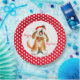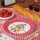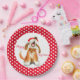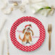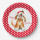 Modernos Navidades brillantes pintaron carol cantando platos de papel festivo con borde de puntos de polka rojo y blanco. Arte y diseño de acuarelas originales de Sarah Trett.