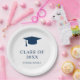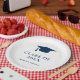Platos modernos de papel de graduación con un diseño sencillo y masculino con "Clase de Año" en gran tipografía audaz junto con una tapa de grado y el nombre del graduado en azul marino sobre un fondo blanco. Estas placas de papel son perfectas para un graduado y son una excelente manera de agregar un toque personal a tu fiesta de graduación.