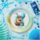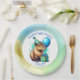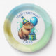 Blue and Green capybara themed boy's Birthday Party personalized paper plates. A watercolor capybara holding a balloon and birthday gift. Cute for kids of any age!