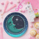 Luna de media luna azul con la cara de un durmiente en un cielo estrellado por la noche. Parte de su cara está iluminada por una estrella brillante blanca. El diseño está situado en un borde de círculo azul con pequeños puntos blancos y azules. El fondo es un degradado de color oscuro a azul claro con estrellas blancas.