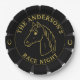 Platos fiestas nocturnos de carreras de caballos, con un elegante retrato de caballos sobre un fondo roseta negro. Todo el texto es personalizable, por lo que puede agregar nombres o fechas, etc