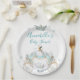 Este mágico y encantador plato fiesta presenta un tema de cuento de hadas de Cenicienta. La parte superior muestra una imagen de una corona de princesa de diseño verde azulado y purpurina de oro con estrellas a juego que la rodean. La parte inferior incluye un calabaza de Cenicienta. Un nombre de ejemplo y un tipo de evento se imprimen en el centro en una fuente verde azulada elegante. Es perfecto para una ducha de bebé, una ducha de novia, una fiesta de cumpleaños, dulces dieciséis, u otra celebración de cuento de hadas.