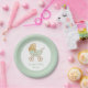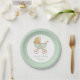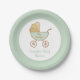 Un lindo plato de papel para bebés con un mínimo de neutralidad de género que incluye una acuarela color verde pastel de menta clara y retro dorado y el nombre de la futura madre en un guión elegante con un fondo de menta a juego. Puede personalizar el texto en el carro de bebés o dejar en blanco.