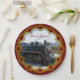 Placas de papel con un tren anticuado con una montaña cubierta de nieve en la casa de fondo para Navidades.