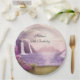 Placas de papel con una imagen escénica de un pacífico lago morado. Rodeado de cerezos y cascadas.