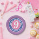 Conmemorar un noveno cumpleaños con un plato de papel decorado con el nombre del destinatario, así como su edad y fecha de nacimiento.