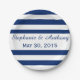 Platos de papel boda de rayas azules y blancas reales. Patrón real de rayas azules y blancas.