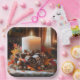 Una vela blanca está rodeada de pinos otoñales, bellotas y hojas de colores