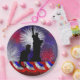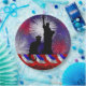 Una silueta del gato negro de Théophile Steinlen para el club Le Chat Noir en un entorno moderno para el 4 de julio. El gato lleva puesto un gorra de tricornio. La Estatua de la Libertad está al fondo, con fuegos artificiales rojos, blancos y azules.