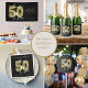 Elegant black and gold “Cheers to 50 Years” design with faux gold number 50 and champagne glasses, which can be customized with your own name and birthday/party date.
