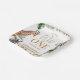 Gender neutral safari themed baby shower paper plate featuring some jungle animals, tropical foliage and cheetah print pattern. This safari wild one baby shower paper plate is ideal for a safari themed baby shower.