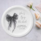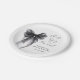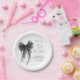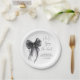 Chic platos de papel para tu despedida de soltera con una elegante aquarela de un lazo coqueto negro, "Ella está atando el nudo" en una letra de caligrafía, y el nombre de la novia y la fecha de la fiesta en letra moderna simple.