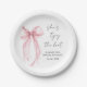 Platos de papel elegantes para despedida de soltera con una acuarela de un lazo coqueto rosa claro, "Ella está atando el nudo" en letra de caligrafía, y el nombre de la novia y la fecha de la fiesta en letra moderna simple.